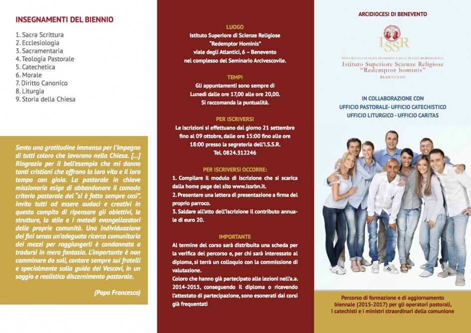 La scuola prevede 30 ore di lezioni frontali e 18 ore di laboratorio. Per i laboratori il testo di riferimento è: S. Soreca, Il catechista: discepolo e comunicatore, EDB, Bologna 2015.