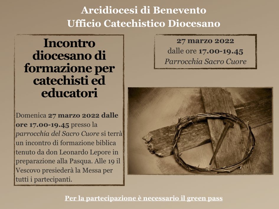 Domenica 27 marzo 2022 dalle ore 17.00-19.45 presso la parrocchia del Sacro Cuore si terrà un incontro di formazione biblica tenuto da don Leonardo Lepore in preparazione alla Pasqua. Alle 19 il Vescovo presiederà la Messa per tutti i partecipanti.